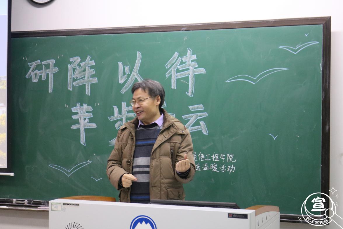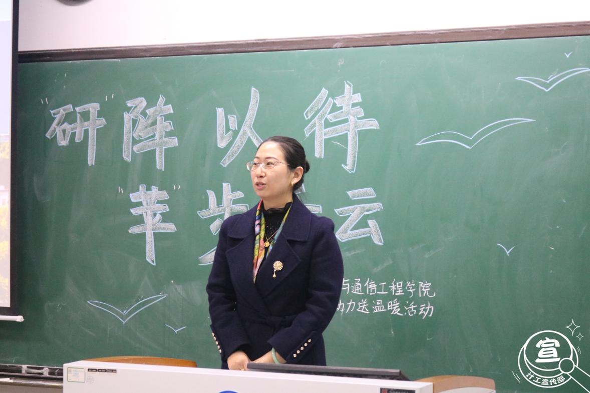考研在即,为缓解同学们备考时的紧张情绪,向他们送上最美好的考研祝福,12月8日,365官网特于工学馆231教室举办“研”阵以待,“苹”步青云考研助力送温暖活动。出席本次活动的有院长刘杰民,副院长刘志刚,党委副书记兼副院长王雪佳,学生办公室主任陈晶晶,2018级电子信息类辅导员庄天宇以及即将奔赴考研战场的全体同学。