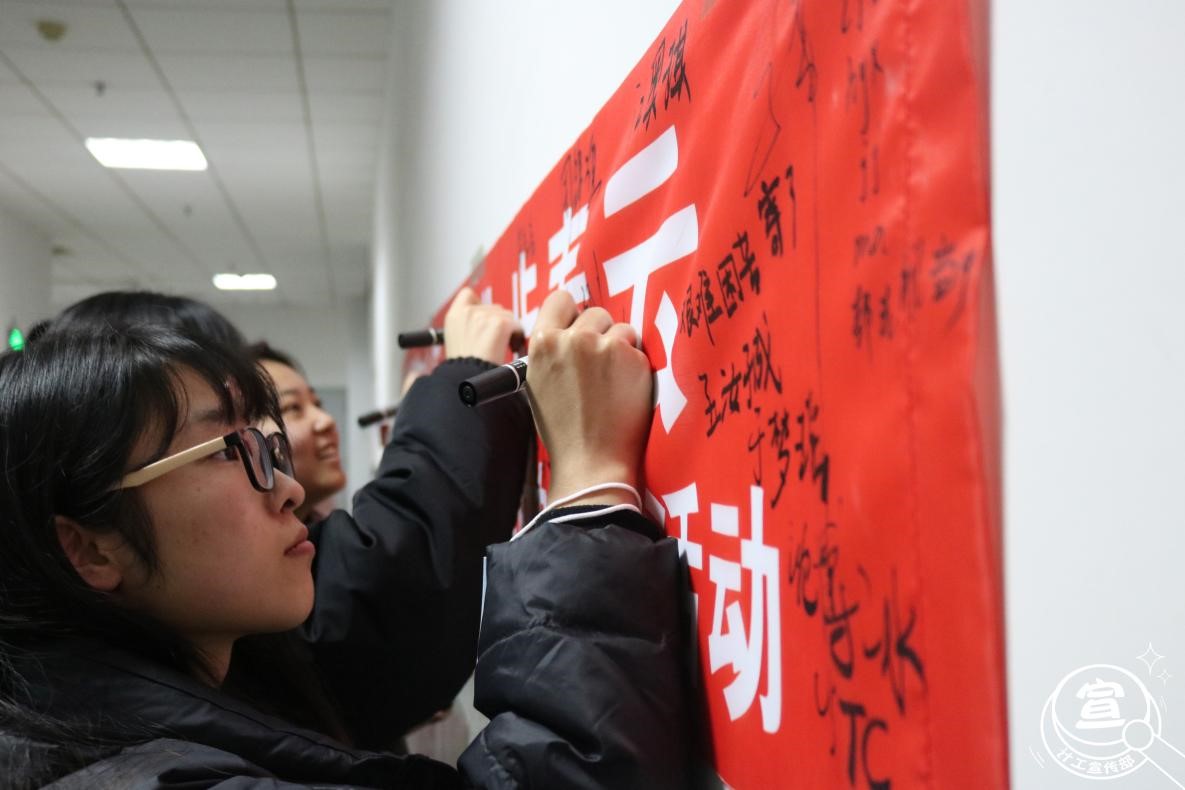 活动在全体学子们“金榜题名,考研必胜”铿锵有力的誓词中接近尾声。最后,即将奔赴考研战场的同学们在场外的横幅上签名留念,坚定有力的落笔充分展现了365官网学子考研必胜的决心。